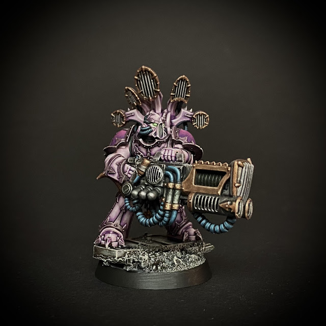 The colour scheme wasn’t easy to come up with as well, and I made 4-5 attempts, stripping them and starting again, until I decided on this. I wanted something that looked unlike any other traitor chapter, with purples, magentas and pinks, while not looking like something from My Little Pony - so I decided on a very desaturated purple/grey/ivory tone for the armour and some purple/magenta for the shoulders to warm up the colour scheme.